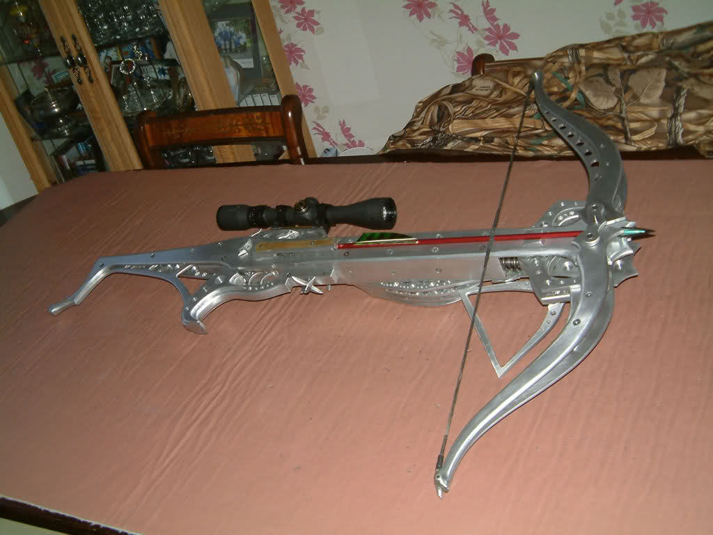 Další je o něco větší kuše podobného vzhledu se dřevěným pažbením,ocelovým ramenem a integrovanou nátahovou klikou...