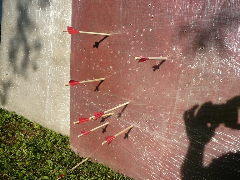 Totální nízkonákladová garážovka. Původně to byla pistolovka s kolíčkovou spouští, kterou jsem tu prezentoval už dřív. Lučiště je ocelové, asi 50 Lbs a koupené z e-shopu jako náhradní díl asi ke kuši Royal. Tělo z bukového prahu. Přidal jsem lehkou pažbu z podélně půlené záclonové tyče. Botka je ze zbytku původního bukového prahu. Tětiva je z prádelní šňůry. Je to srandovně lehké a malé. Ještě uvažuju, že časem přidám nějakou páku na kolíček spouště. Zatím kolík vytlačuju prstem zespoda. Kolík chodí dost ztuha a musí se proto v otvoru mazat jelením lojem. Nemá to miřidla, tak se míří "tak ňák směrem k terči". Střílí to asi 20cm dlouhé šipky udělané z jídelních tyčinek z vietnamského obchodu. Kormidla z lepicí pásky. Špičky ořezané ořezávátkem. Po ořezání špiček je tvar šipek bikonický, zní to náležitě vědecky. Lítá to tak do 20 metrů vcelku rovně a jde spolehlivě zasáhnout metrový terč. Prostřelí to koberec, zapíchne se to do terčovnice asi tak do hloubky 2 cm.