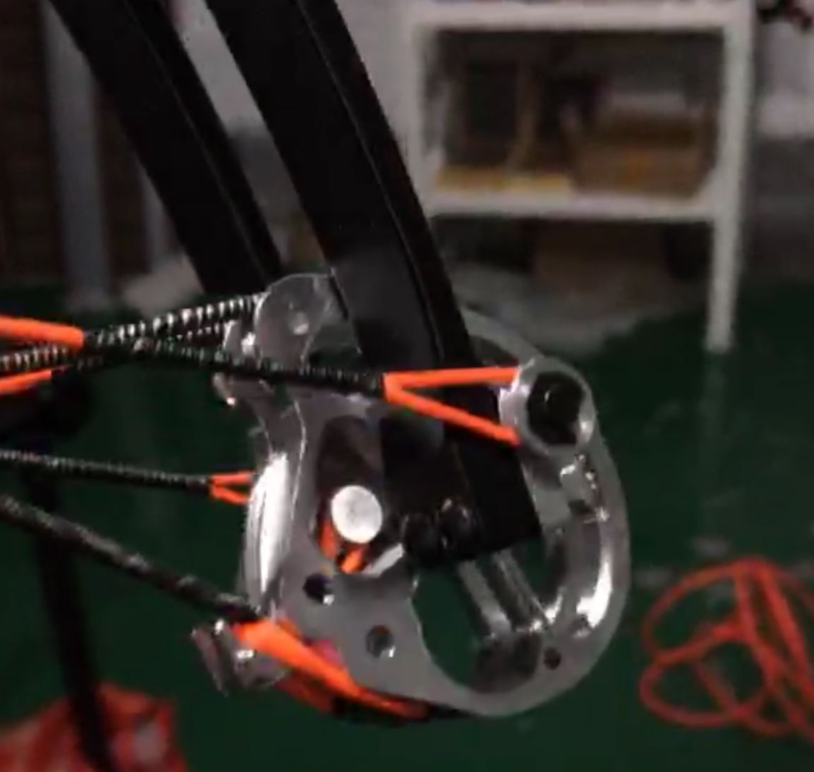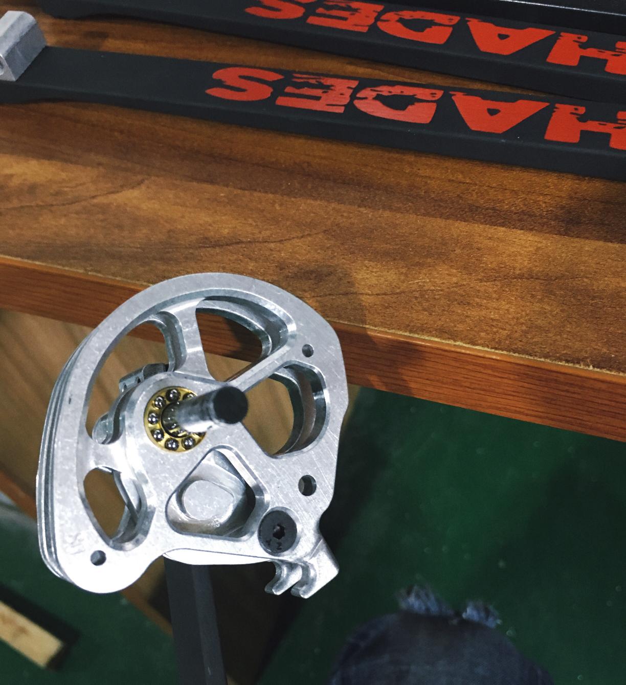 Za povšimnutí stojí určitě netradiční kladky, které mají dvě drážky pro „dvě“ tětivy. Uprostřed je šachtička (nejspíš z magnetu) pro založení ocelové kuličky. Tětiva využívá systému D-loop, tudíž není potřeba řešit omotávku. Kladky jsou uloženy na kuličkových ložiskách.