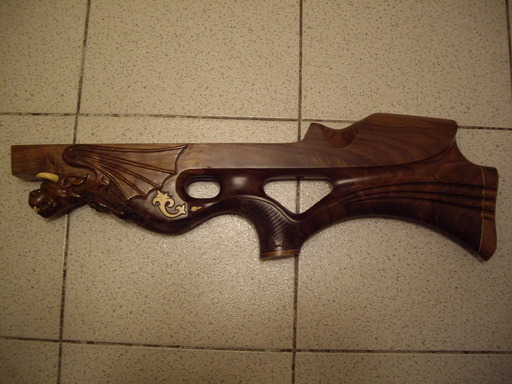 Exkluzivní ořechová pažba k typu Goblin, vykládaná kostí, zlacené části -cena 6 500 rublů (cca 2 500,- Kč)
