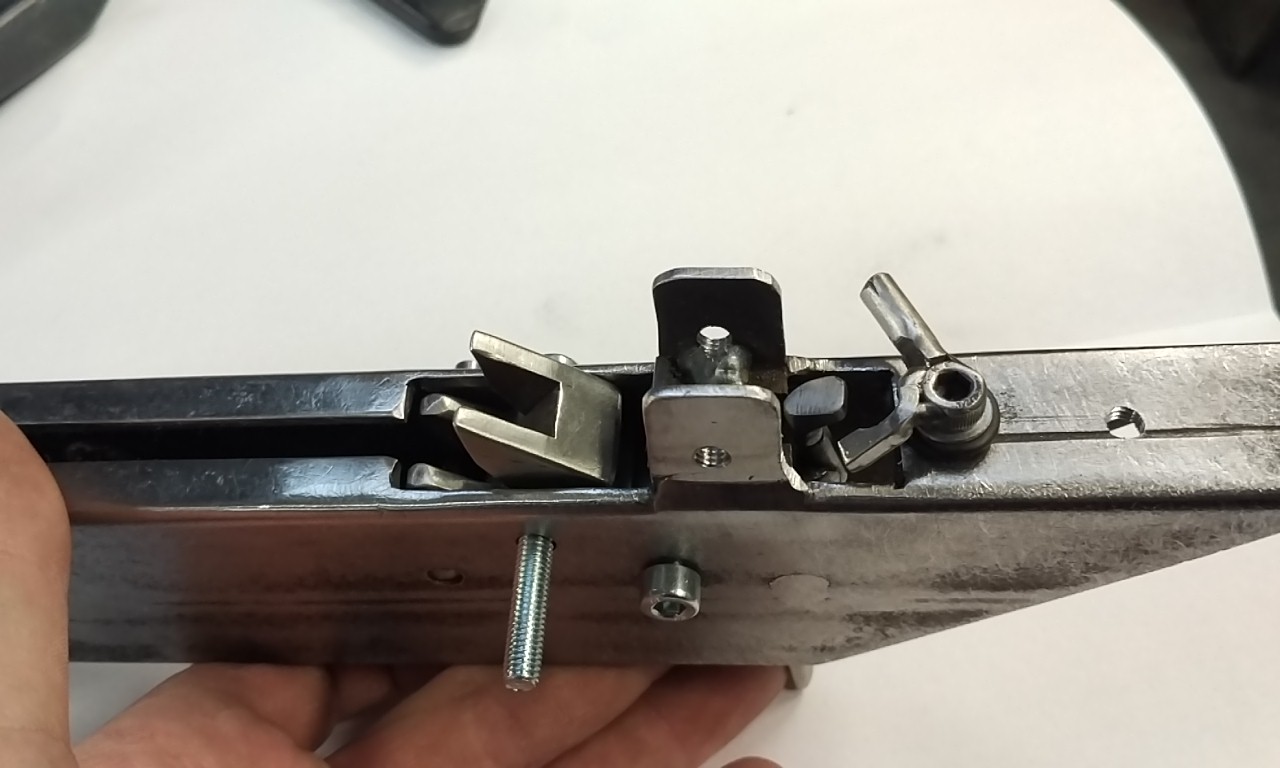 Jinak práce trochu pokročila. Doladění mechanismu. Pojistka je velice primitivní, ale funkční. Musel jsem trochu prodloužit konec jeklu. Přítlačné perko na šíp je zhotoveno ze stahovacich pasku, co se používá na přepravu palet s materiálem, pásky jsou pružné. Perko je na pevno svařené, nechtěl jsem, aby se třeba časem samovolně povoloval, je to pak opruz to furt štelovat. Šrouby použiju jiné, z plochou hlavou. Teď začnu shánět materiál na pažbu, rozhodl jsem se pro jasan, nebo máte lepší nápad? Budu rád za radu.