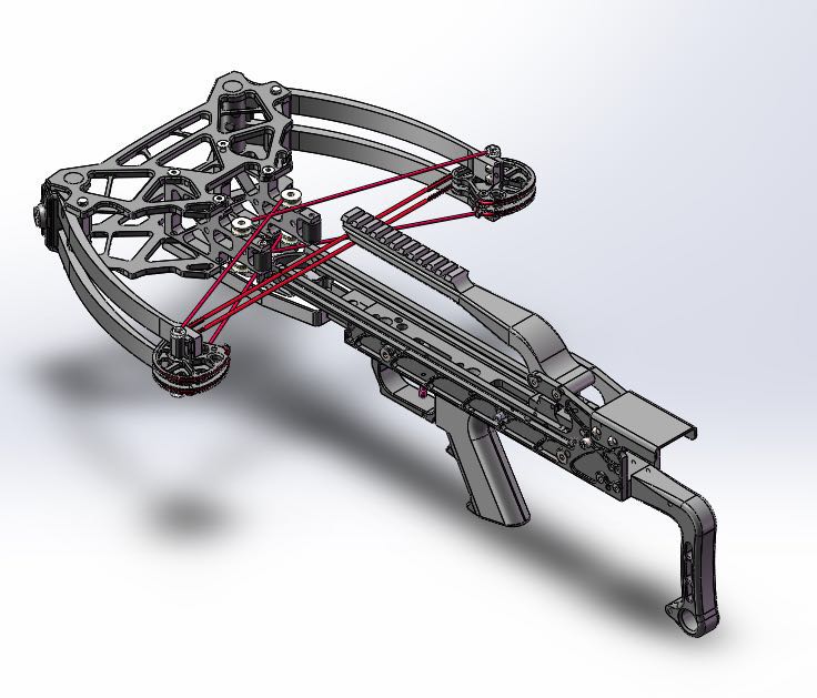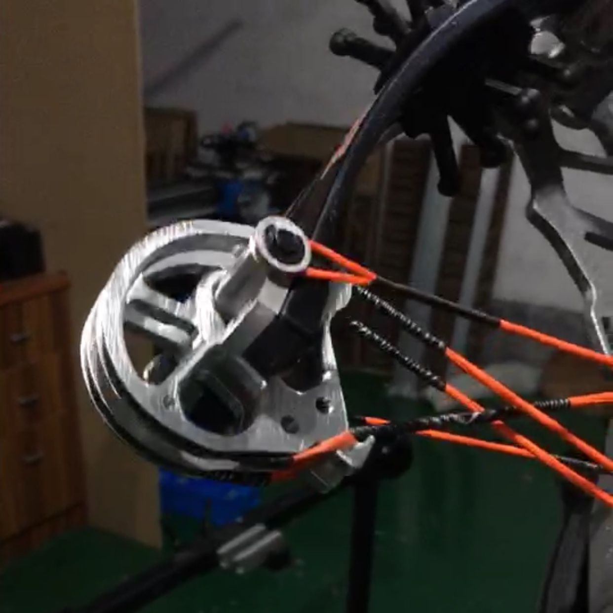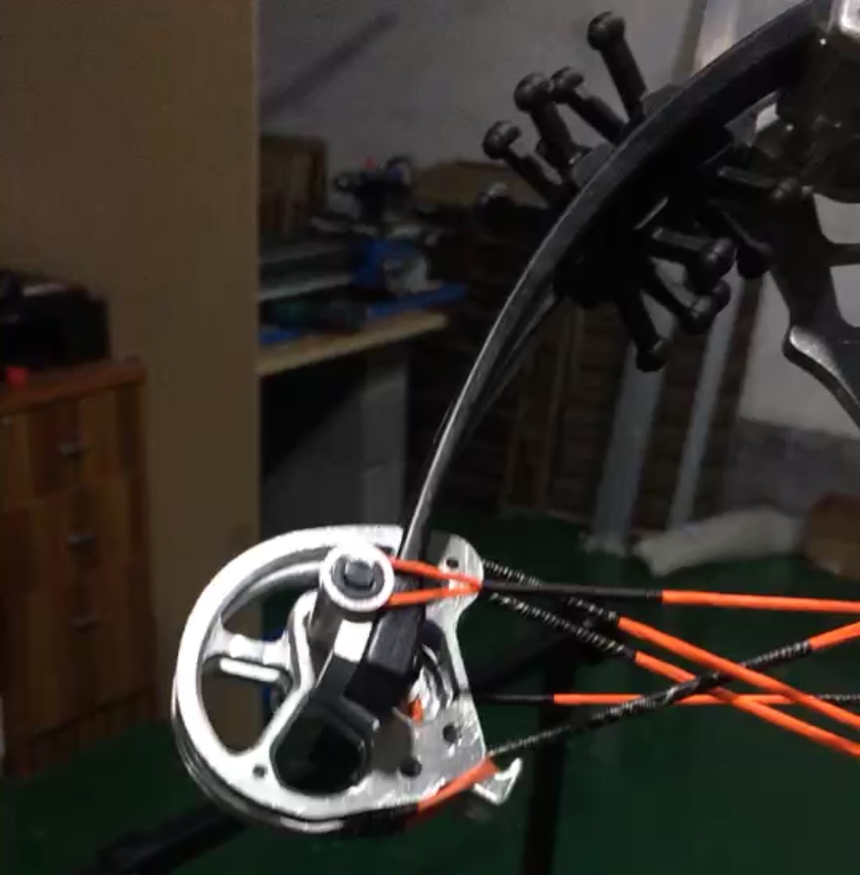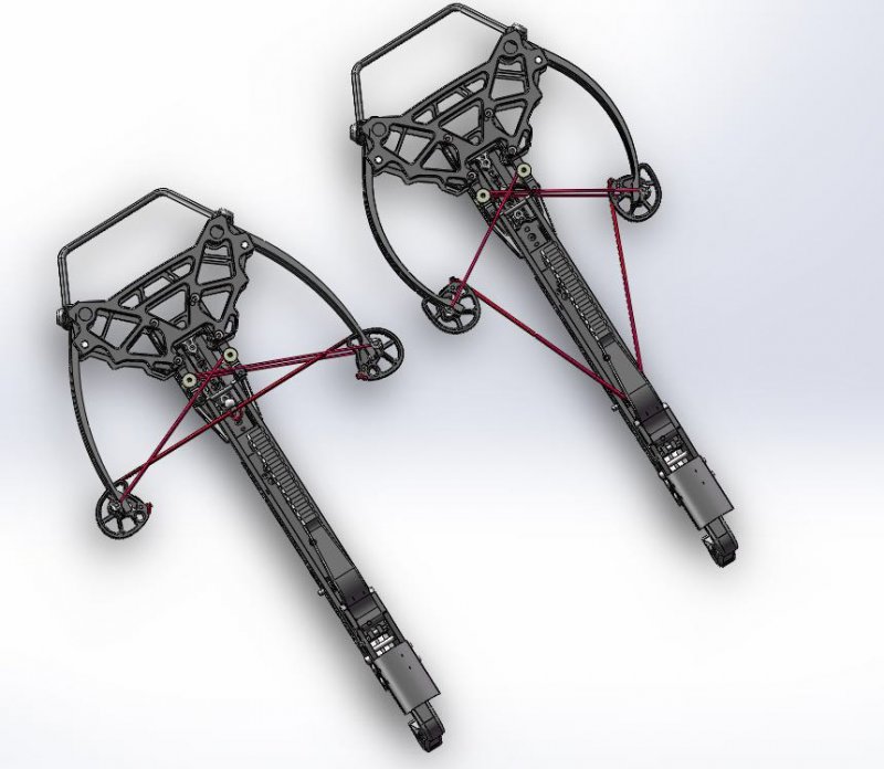 Za povšimnutí stojí určitě netradiční kladky, které mají dvě drážky pro „dvě“ tětivy. Uprostřed je šachtička (nejspíš z magnetu) pro založení ocelové kuličky. Tětiva využívá systému D-loop, tudíž není potřeba řešit omotávku. Kladky jsou uloženy na kuličkových ložiskách.