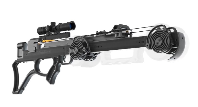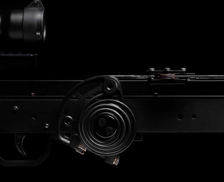 Jde o pár nadšenců, lovců a střelců z kuše, kteří v domácích podmínkách vyvinuli velice zajimavý koncept kuše. Trochu mi připomíná švýcarskou kuši bez ramen Marcela Burriho z 80.tých let, kde energii obstarávala dvojice tažných pružin po stranách railu. Zde rovněž neobstarávají energii výstřelu, jako u většiny současné produkce, různé variace pružných ramen, ale torzní pružiny (pera). Ty jsou umístěny po stranách railu vpředu a vzadu, otáčejí se proti sobě a přes systém kladek tak spolupracují a urychlují šíp. Díky tomuto systému je kuše velice úzká (3,9”!) a v tomto směru nemá konkurenci. Nátahová síla činí 170 lb, délka nátahu bezkonkurenčně dlouhých 24”. K napinání slouží externí kličkový mechanismus.