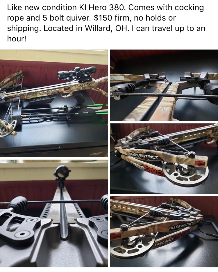 Ještě k tématu té levné kladkové kuše dle předlohy KI. Zrovna včera jsem na amerických inzertních fórech narazil na starší originál Killer Instinct Hero 380. Stav výborný. Cena 150$. Vezměte si čtyřnásobný plat oproti tomu u nás a pak pochopíte, že je to jiný svět a úplně jiné možnosti.