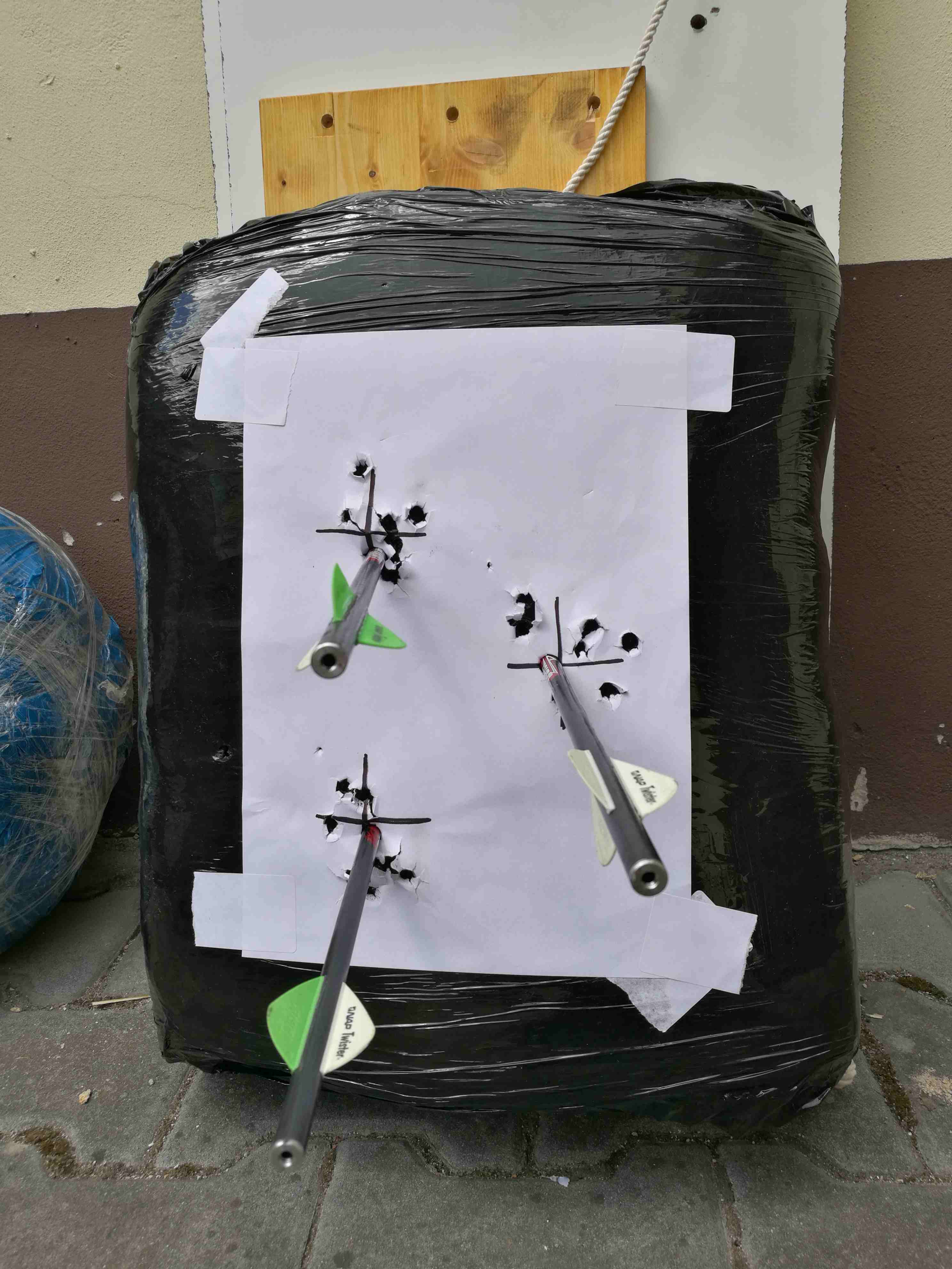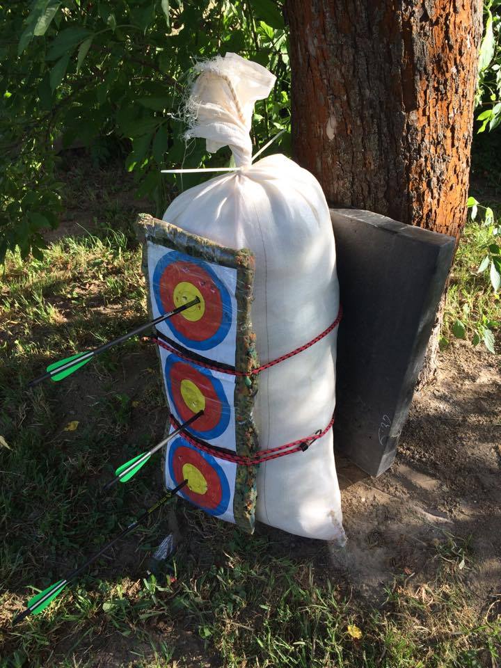 Celkem má za sebou už cca 100 zásahů. některý šípy jdou skrz (silná kuše), proto jsem musel dát za terčovnici smrkovou spárovku. Výhoda je, že má plochou čelní stranu a dá se na ní lehce přilepit terč. Nevýhoda je, že ve volném terénu (na louce) je třeba z druhé strany ji nějakým klackem podepřít. Terčovnice se postupně ze zadní strany vybouluje, tak je třeba ji pravidelně otáčet... Časem ji opět převážu černou strečovou folií. Přijde mi, že pokud hadry nejsou v terčovnici úplně slisovaný, tak mají větší zastavovací účinek (srovnání s mojí předchozí modrou koulí), ale těžko srovnávat když se výplň terčovnic lehce liší.