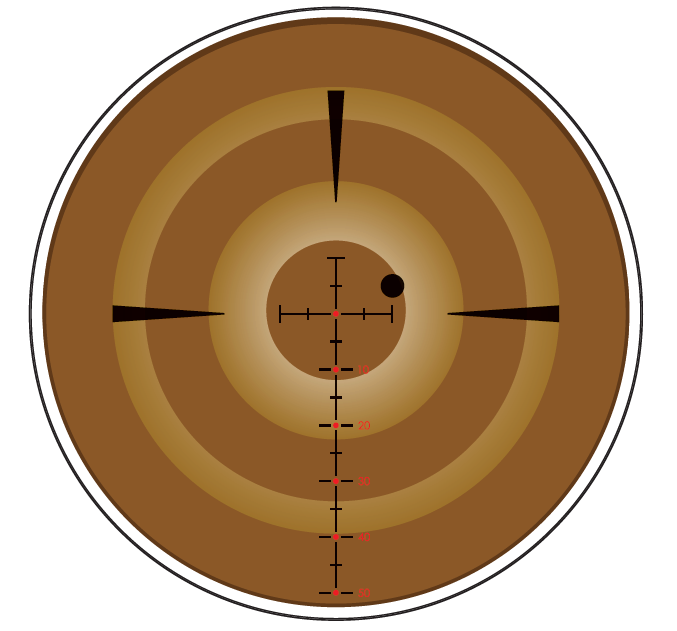 Máme-li tedy zásah v terči jako v předchozím obrázku, tak při 1/4násobném zvětšení budou hodnoty odpovídat 10x4 = 40 MOA doleva a 5x4 = 20 MOA dolů (při zvětšení 3x).