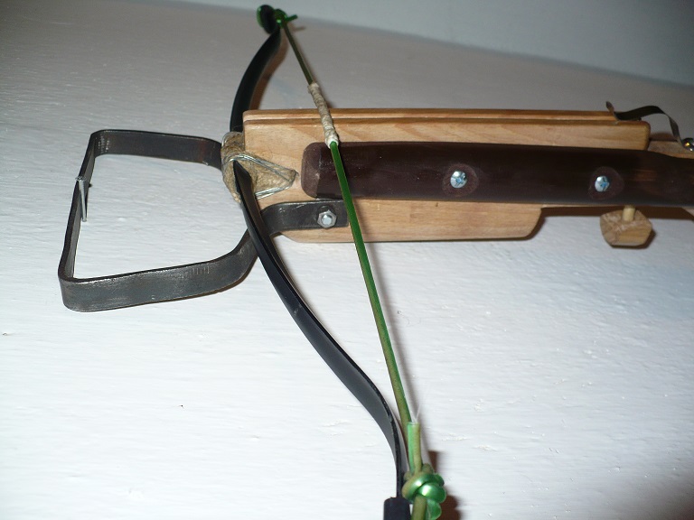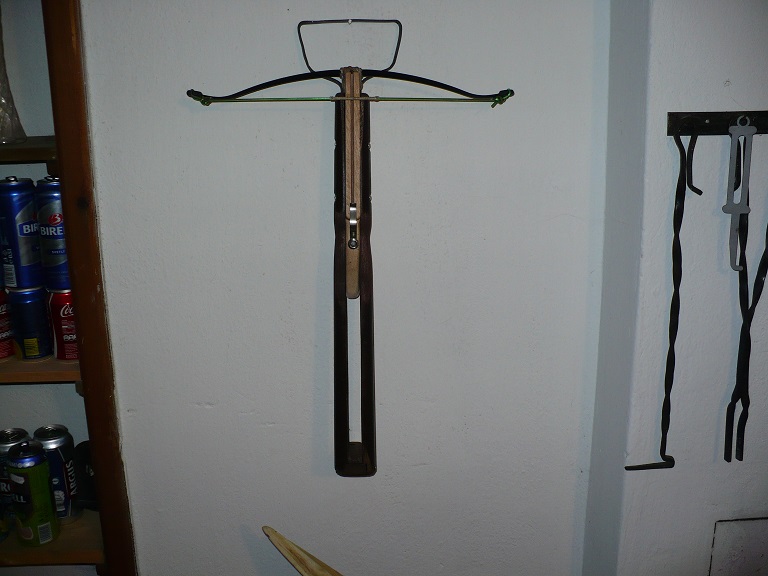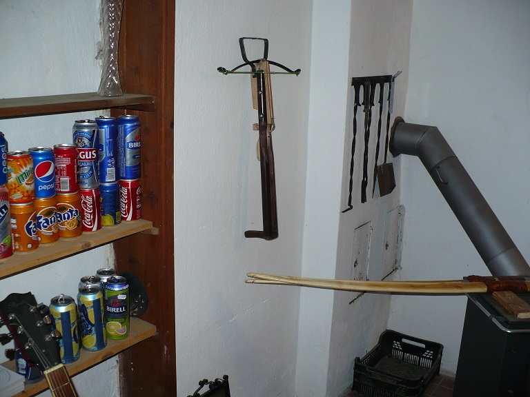 Totální nízkonákladová garážovka. Původně to byla pistolovka s kolíčkovou spouští, kterou jsem tu prezentoval už dřív. Lučiště je ocelové, asi 50 Lbs a koupené z e-shopu jako náhradní díl asi ke kuši Royal. Tělo z bukového prahu. Přidal jsem lehkou pažbu z podélně půlené záclonové tyče. Botka je ze zbytku původního bukového prahu. Tětiva je z prádelní šňůry. Je to srandovně lehké a malé. Ještě uvažuju, že časem přidám nějakou páku na kolíček spouště. Zatím kolík vytlačuju prstem zespoda. Kolík chodí dost ztuha a musí se proto v otvoru mazat jelením lojem. Nemá to miřidla, tak se míří "tak ňák směrem k terči". Střílí to asi 20cm dlouhé šipky udělané z jídelních tyčinek z vietnamského obchodu. Kormidla z lepicí pásky. Špičky ořezané ořezávátkem. Po ořezání špiček je tvar šipek bikonický, zní to náležitě vědecky. Lítá to tak do 20 metrů vcelku rovně a jde spolehlivě zasáhnout metrový terč. Prostřelí to koberec, zapíchne se to do terčovnice asi tak do hloubky 2 cm.