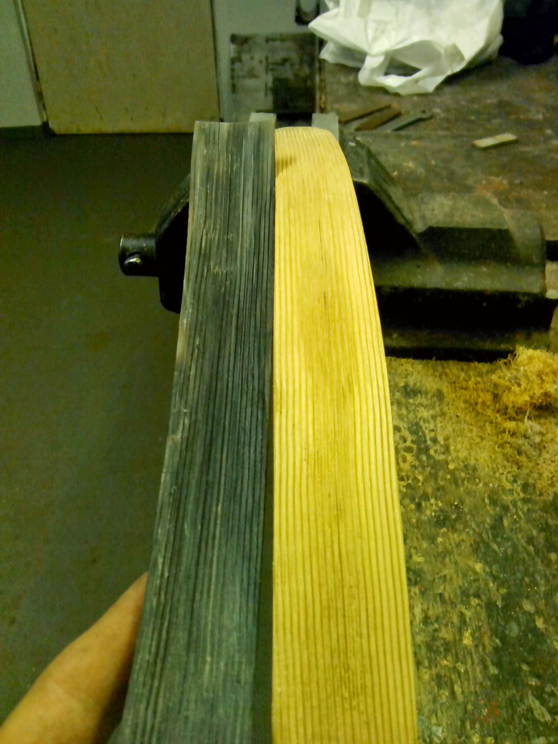 Trošku oříšek je u toho bambusu trefit tiller, protože se lepí obě vrstvy tou tvrdou stranou ven, takže tiller musí být hotovej před slepením, pak už jde tillerovat jen trochu z boků, ta tvrdá vrstva se nesmí porušit.