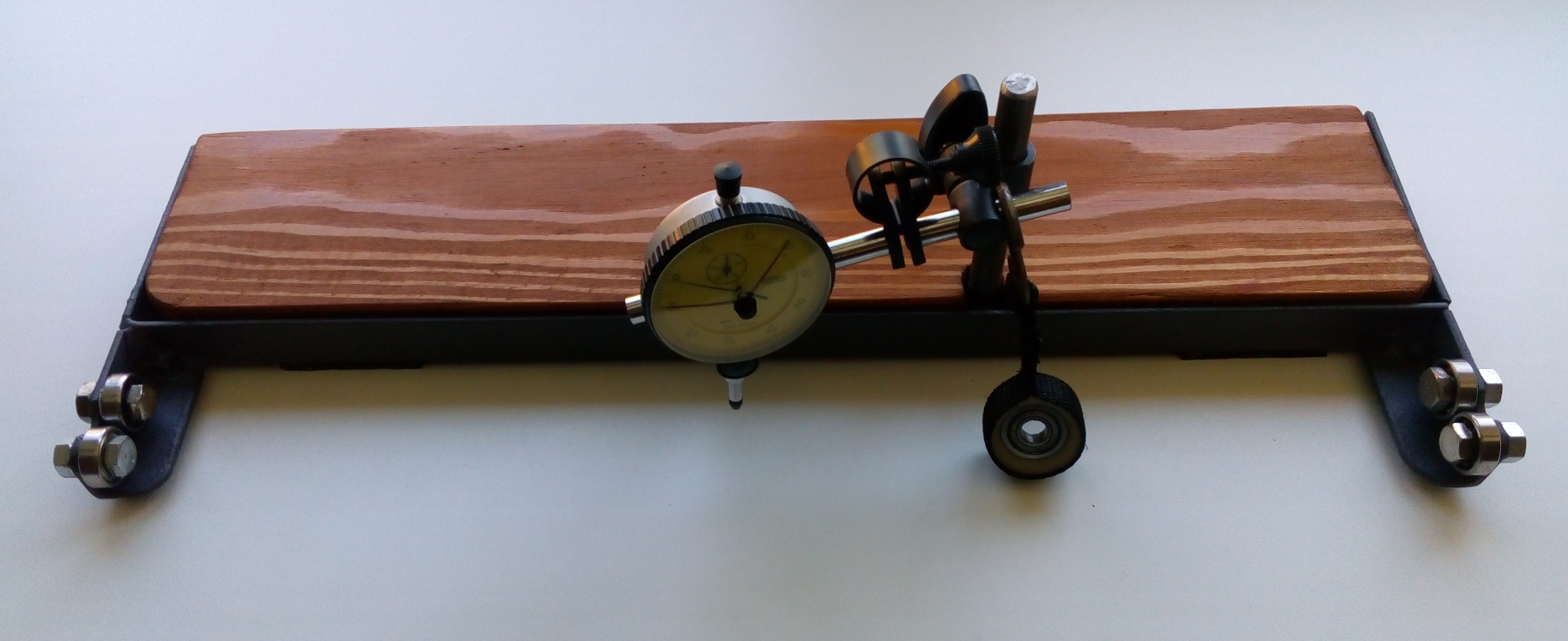 Na určení jak statického, tak dynamického spinu ti stačí zařízení, jako je uvedeno na videu výše (budu se na něho odkazovat). Dá se samozřejmě ten spine tester už koupit vyrobený, ale je to zbytečně drahé. Vyrábí to například firma RAM. Účel tkví teda v tom, že položíš trubku na ty ložiska, doprostřed přiložíš číselníkový úchylkoměr a nastavíš 0. Američani používají úchylkoměr s citlivostí 0,001'' což je 0,025 mm, takže bohatě stačí u nás zakoupený mechanický s přesností 0,01 mm. Dá se pořídit mechanický s citlivostí 0,005 mm, ale je už o 500 Kč dražší. Digitální úchylkoměry s přesností na tisíciny jsou již pro toto měření zcela zbytečné. Následně doprostřed trubky, v místě úchylkoměru, zavěsíš závaží (cca 1,1 kg).