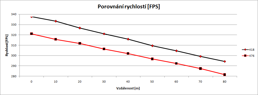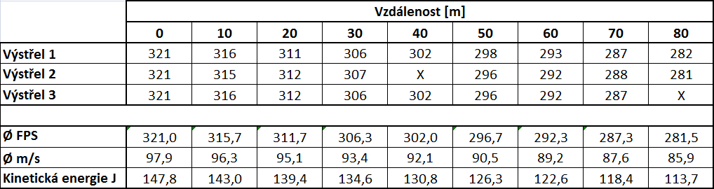 Dnes jsem měl chvíli čas, tak jsem šel otestovat těžší šíp. Opět Pro Elite od Tenpointu, tentokrát s 145 grainovým hrotem a lumenokem. Celková váha tedy 476 grainů. Měl jsem jen hodinku čas a chtěl jsem udělat ještě minimálně jedno měření podobného rázu, tak jsem střílel jen 3 šípy opět na vzdálenosti 0-80 metrů po deseti metrech. Zde je tabulka s hodnotami: