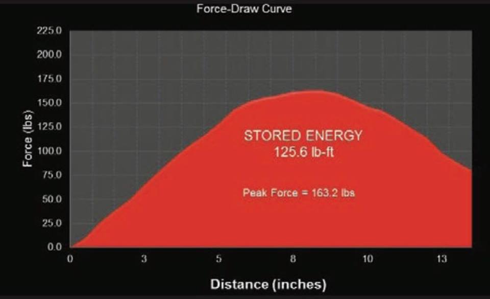Síla nátahu stoupá až do maximální síly nátahu zhruba v 9" nátahu a pak klesá, takže na 13,5" délky nátahu, zatěžuje záchyt pouze 80 lb síly. Uložená energie v ramenech je 170 joule, při nejvyšší dynamické účinnosti 76%, dosažené s těžkým šípem 525 grainu, dostáváme energii šípu téměř 130 joule. To jsou velice blízké hodnoty.